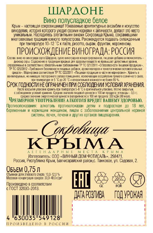 Вино Сокровища Крыма Шардоне белое полусладкое, 0.75л