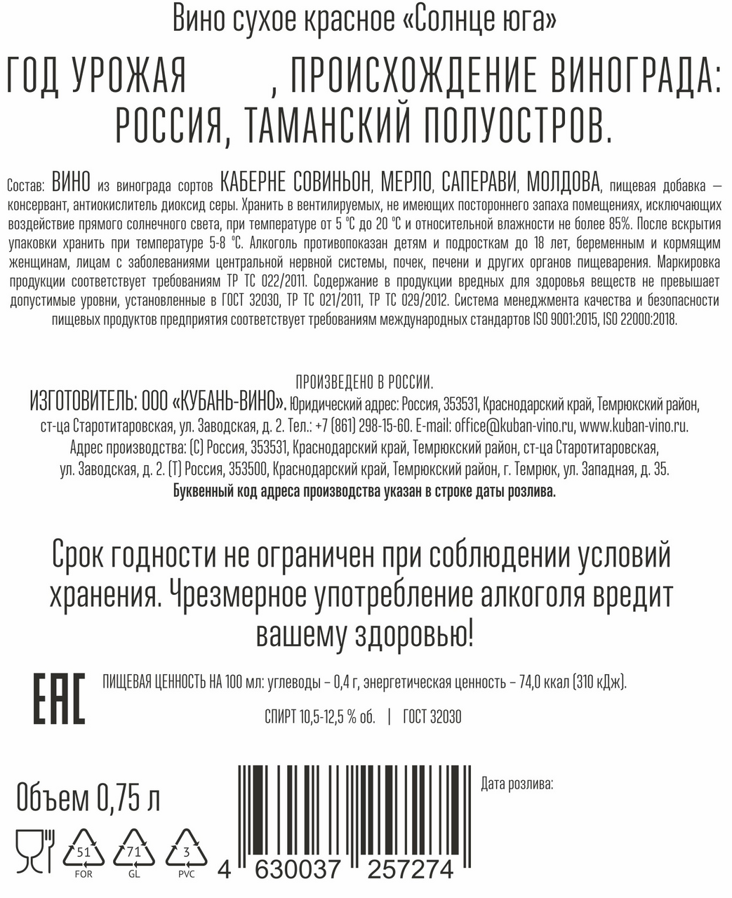 Вино Солнце Юга красное сухое изготовлено из винограда, произрастающего на собственных виноградниках компании в уникальных природно-климатических условиях долины Дона, которая протянулась от Ростова на востоке до Цимлянского моря на западе, а сами виноградники раскинулись по берегам Дона. После сбора урожая по достижении ягодами оптимальной спелости, виноград винифицируется традиционными для красных вин методами. Вино рекомендуется сочетать с мясными блюдами, барбекю, пиццей и пастой.