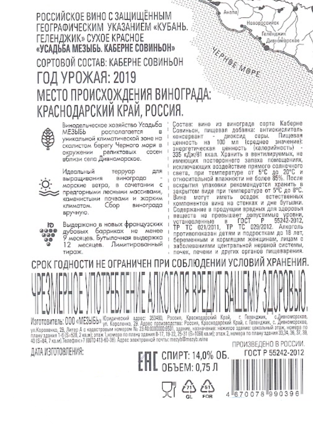 Вино Усадьба Мезыбь Каберне Совиньон красное сухое, 0.75л