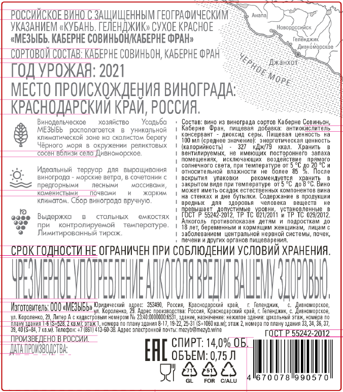Вино Усадьба Мезыбь Каберне Совиньон и Каберне Фран красное сухое, 0.75л
