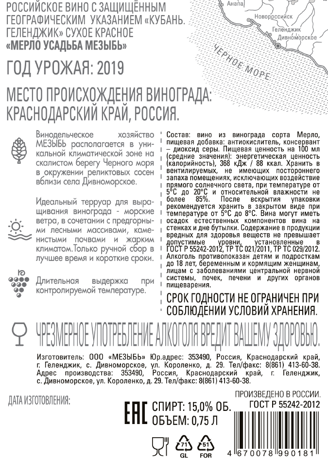 Вино Усадьба Мезыбь Мерло красное сухое, 0.75л