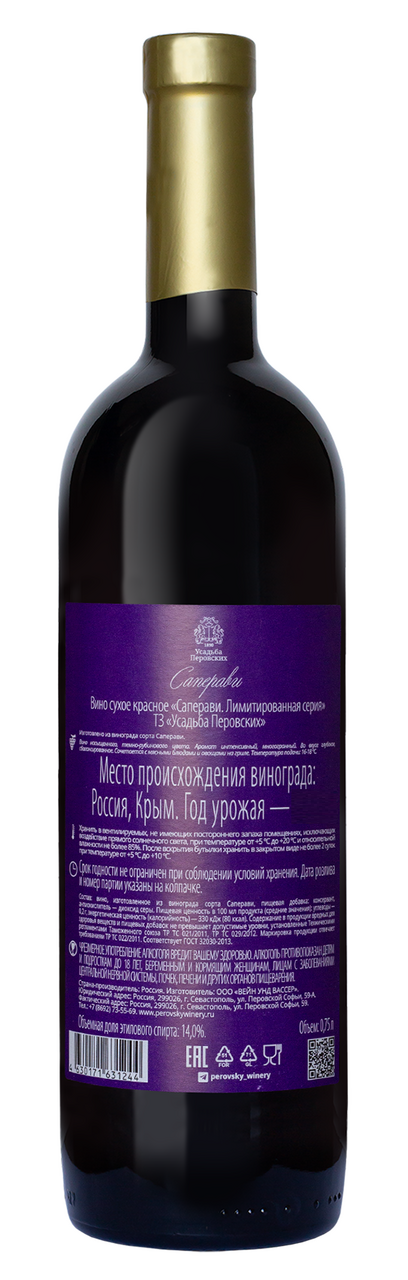 Саперави - 100%. Виноградник - Крым. Выдержка не менее 18 месяцев в дубе. Вино насыщенного темно-гранатового цвета. Аромат богатый и щедрый, соткан из ноток темных ягод черной смородины, вишни и специй. Очень яркое, насыщенное красное сухое вино с приятным фруктово-ягодным ароматом и щедрым, отлично сбалансированным вкусом. Для изготовления вина используется древний грузинский сорт винограда Саперави, выращенный на виноградниках Крыма. Ферментация сусла проходит в емкостях из нержавеющей стали при строго контролируемой температуре, а для выдержки в течение 18 месяцев используются бочки из американского дуба, что придает вину оптимальный баланс между сортовой свежестью и глубиной вкуса. Это выразительное, интенсивное красное сухое вино идеально дополнит вкус мяса, приготовленного на гриле, стейка, свиных ребрышек в пикантной заправке, а также выдержанных сыров.