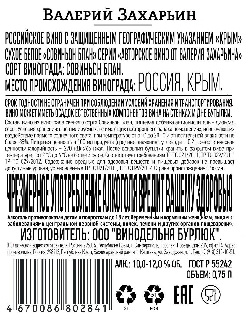 Вино Валерий Захарьин Совиньон блан авторское белое сухое, 0.75л