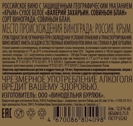 Авторское моносортовое тихое вино от винодела Валерия Захарьина, позволит потребителю ближе познакомиться с сортами винограда, что позволит ценителям разбираться в купажах тихого вина. Легкое, питкое, свежее белое сухое вино из винограда сорта Совиньон Блан, который выращивается на собственных виноградниках Валерия Захарьина в селе Кочергино Бахчисарайского района Крыма. После сбора урожая, который осуществляется в момент оптимальной спелости ягод, виноград подвергается традиционной винификации при контролируемой температуре.