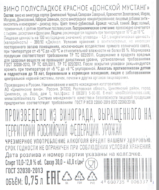 Вино из винограда сортов Цимлянский черный, Саперави Северный, Красностоп Золотовский, Мерло, Молдова, Денисовский, Каберне Совиньон, пишевые добавки: антиокислитель и консервант - диоксид серы.