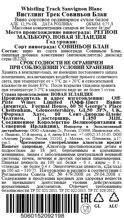 Вино из сорта винограда Совиньон Блан, пищевая добавка: консервант (антиокислитель) диоксид серы (E220).