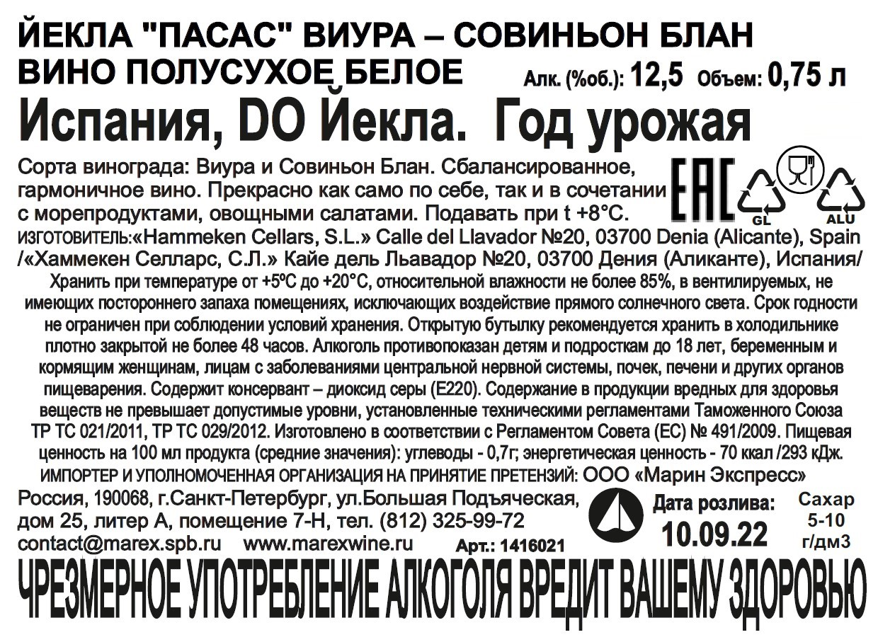 Вино Pasas Yecla Viura Sauvignon Blanc белое полусухое, 0.75л