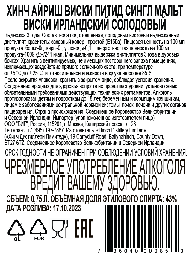 Это торфяной односолодовый виски тройной дистилляции, обладающий гладким сладким солодовым вкусом и сложным торфяным ароматом, что делает его поистине уникальным. Этот смелый, инновационный, современный ирландский виски производится в графстве Даун. В производстве используется вода из гор Морн, кристально чистая, дар самой природы. Традиционные ирландские процессы затирания, тройная дистилляция и угольная фильтрация позволяют создавать виски премиум качества. Перегонные кубы компании Hinch Distillery специально разработаны с учетом рефлюкса, что позволяет взаимодействовать парам и меди в течение дополнительного времени, необходимого для создания более выдающегося вкусового профиля. Виски Хинч Питед Сингл Молт выдерживается не менее 3-х лет в дубовых бочках.