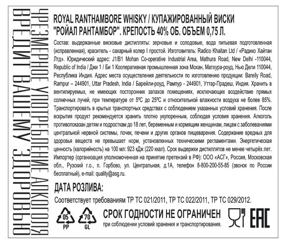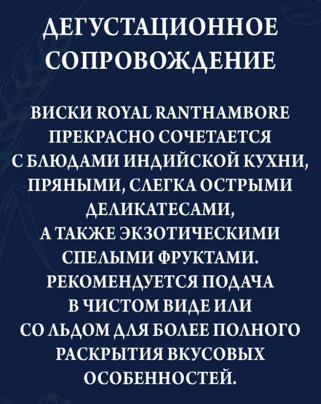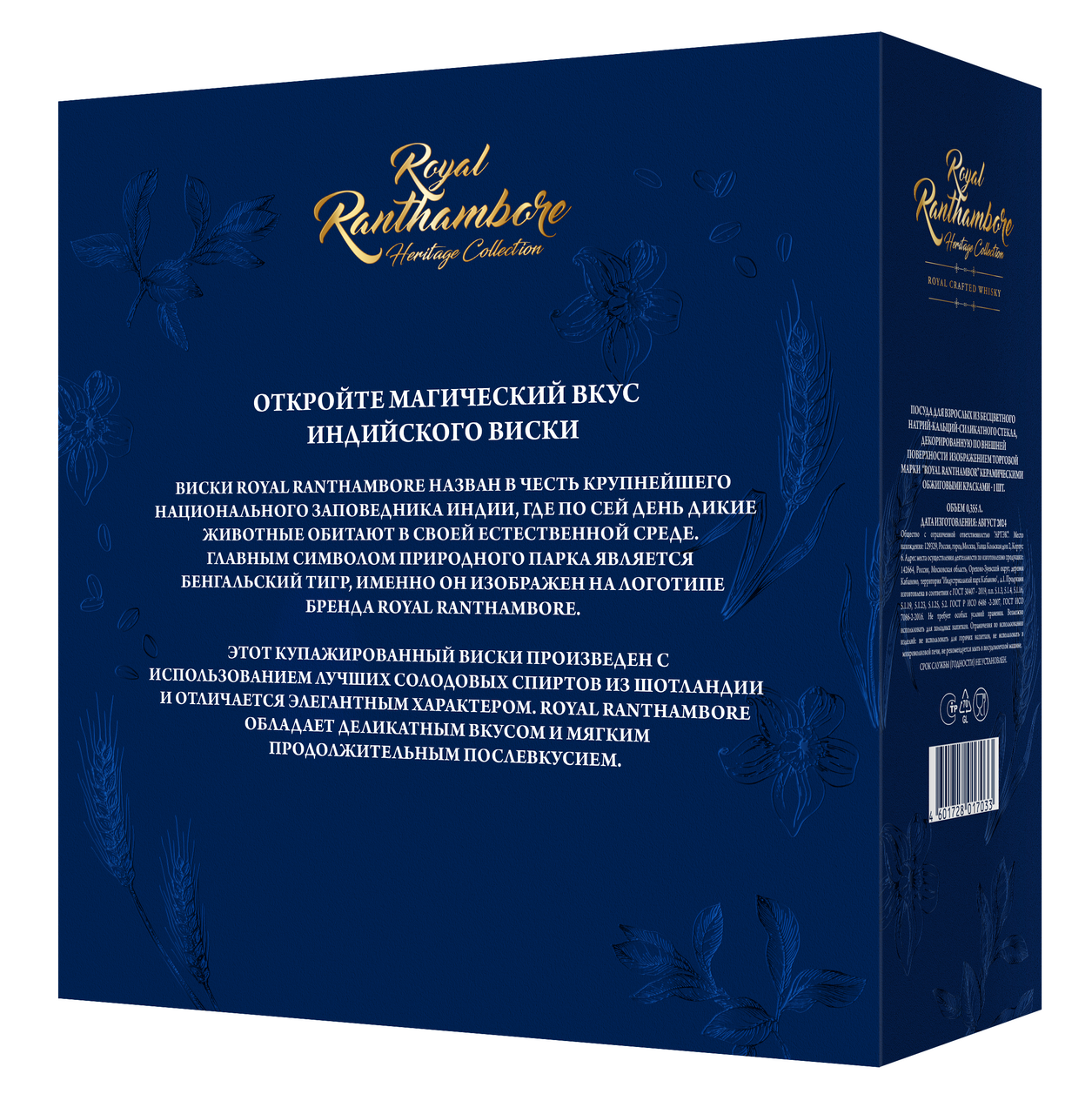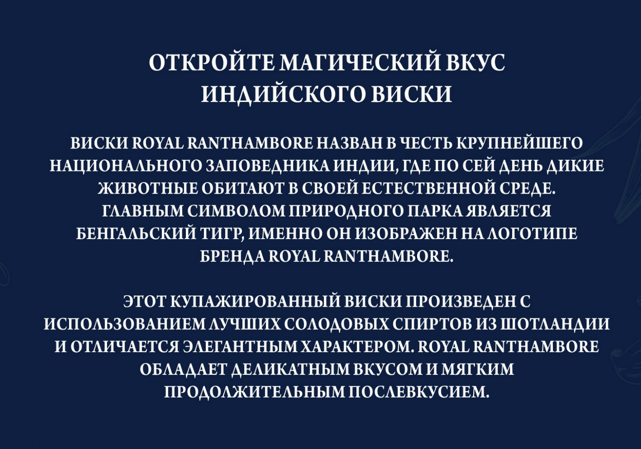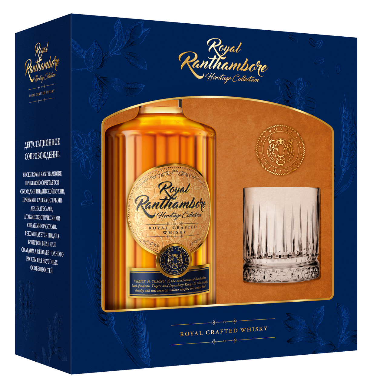 Роскошный купажированный виски, ода Рантхамбору, где правили короли прошлых лет и где свободно бродят доблестные тигры. Этот редкий виски - дань величию места, которое олицетворяет великолепных тигров и королей-воинов. Вдохновленный этим союзом дикости и элегантности, Royal Ranthambore представляет собой богатую симфонию вкуса, аромата и послевкусия. Компания Radico Khaitan занимается поддержкой заповедника тигров в национальном парке Рантхамбор. Разрабатывая логотип и упаковку виски Royal Ranthambore производитель делал акцент на повышении осведомленности об инициативе Спасем тигра. Компания делает свой вклад в сохранение популяции тигров, поскольку это самые величественные животные на земле. Рантхамбор - один из немногих заповедников, в котором можно увидеть тигров в естественной среде.