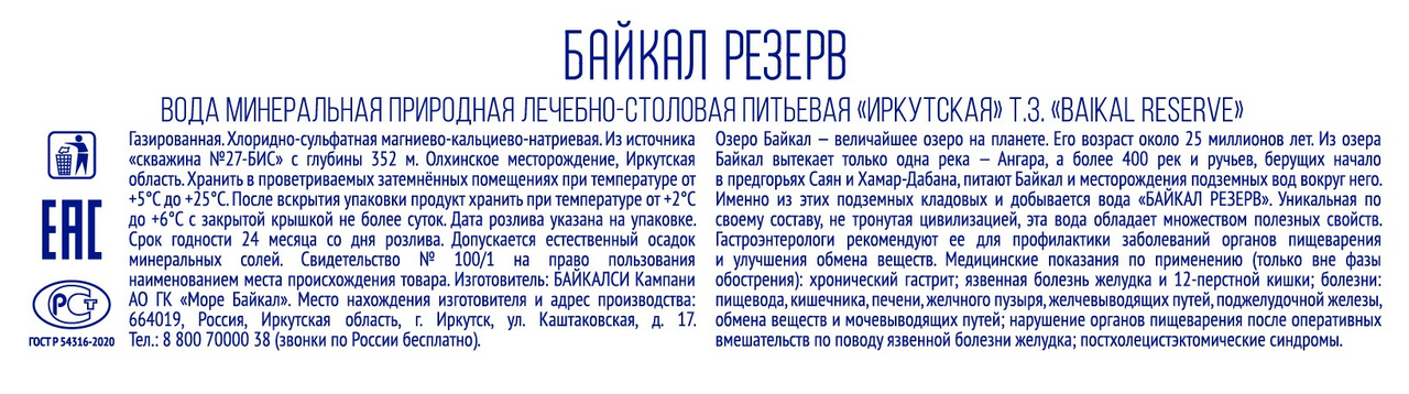 Минеральная лечебно-столовая вода BAIKAL RESERVE уникальна по своим качествам благодаря происхождению из холодного источника, ее лечебные свойства известны людям с 60-х годов прошлого века: она помогает пищеварению и улучшает кровоснабжение всего организма. Естественные характеристики воды позволяют сохранять лечебные свойства на протяжении длительного времени, что делает BAIKAL RESERVE особенной ценной для тех, кто ищет натуральные способы поддержания здоровья.