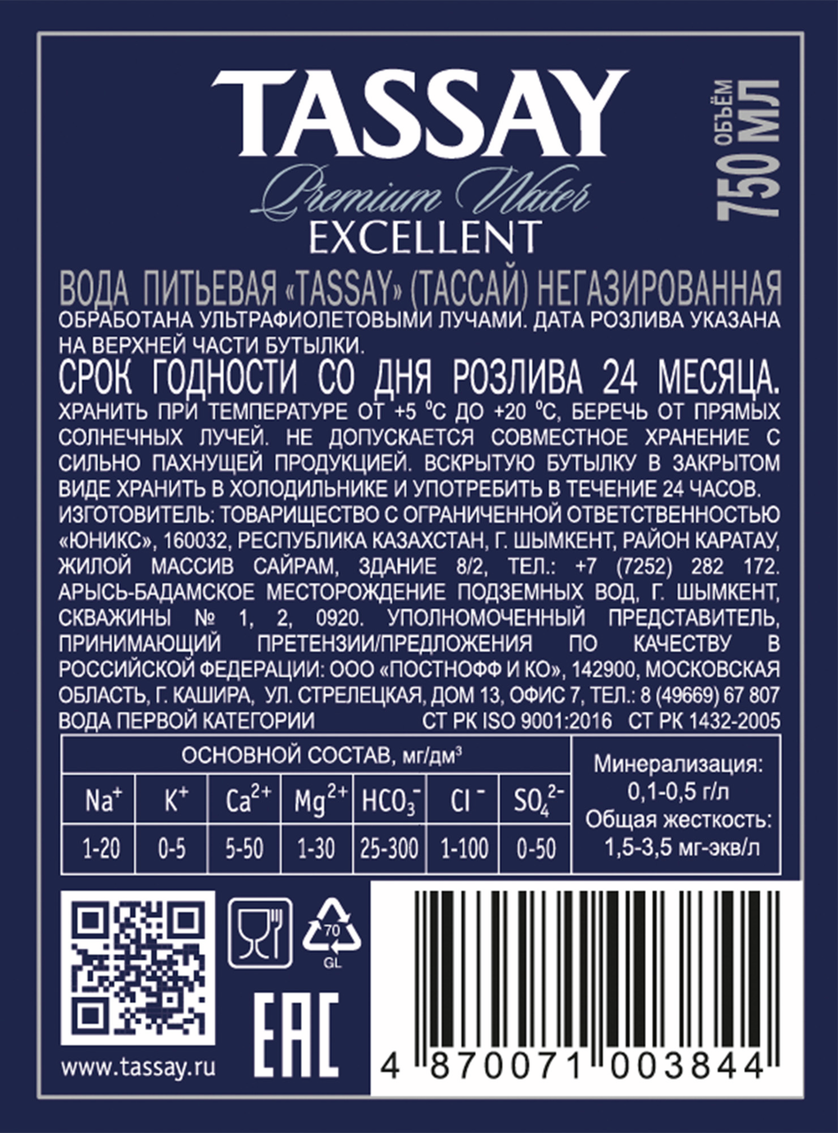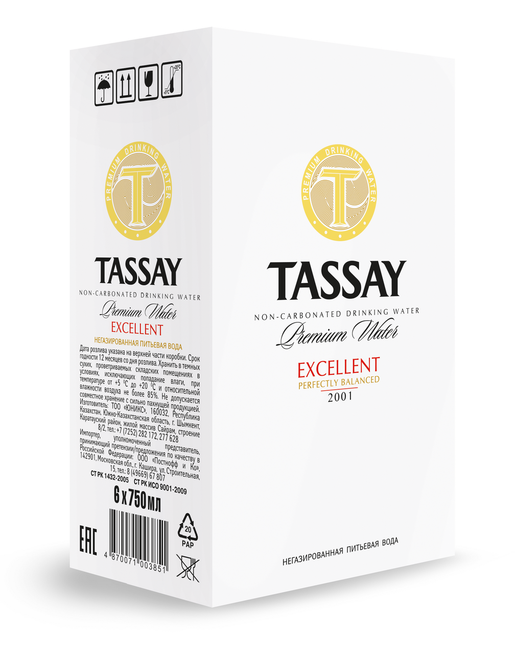 Особое издание Excellent - это эксклюзивный дизайн и природные свойства воды из предгорий Тянь-Шаня. Негазированная вода из премиальной линейки Тассай. Ее отличает не только эксклюзивный дизайн, но и более высокое качество благодаря дополнительной фильтрации серебром. Вода, обладая приятным, мягким вкусом, быстро утоляет жажду в знойный день, а также отлично подходит для создания напитков. Тассай Экселент выпускается в стеклянных бутылках сапфирового цвета, которые украсят стол на любом торжестве или деловой встрече.
