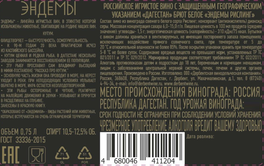 Вино игристое Эндемы Рислинг белое брют, 0.75л