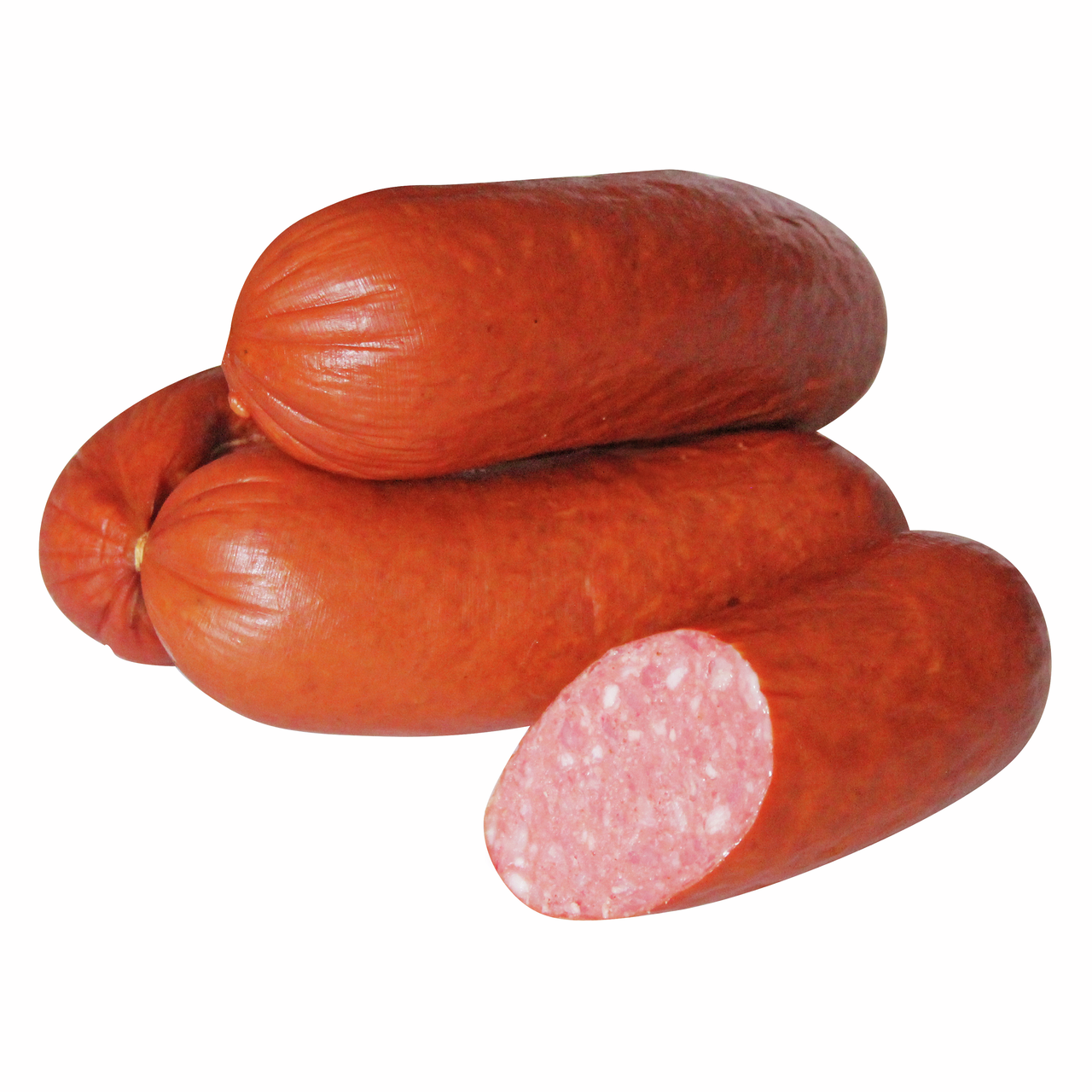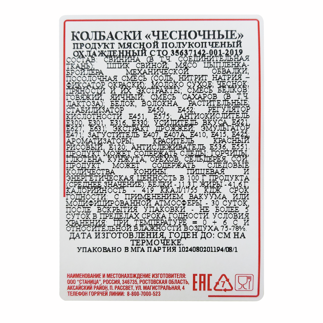 Свинина (в том числе соединительная ткань), шпик свиной, мясо цыпленка-бройлера механической обвалки, посолочная смесь (соль, нитрит натрия фиксатор окраски), молоко сухое, чеснок, пряности и их экстракты, смесь белков: говяжий, яичный, смесь сахаров (в том числе лактоза), белок, волокна растительные, стабилизатор Е450, Е452, регулятор кислотности Е451, Е575, антиокислитель Е300, Е301, Е316, Е330, усилитель вкуса Е621, Е627, Е631, экстракт дрожжей, эмульгатор Е471, Е472с, загуститель Е407, Е407а, Е410, Е415, Е425, Е466, ароматизаторы, краситель красный рисовый, Е120, антислеживатель Е536, Е551.