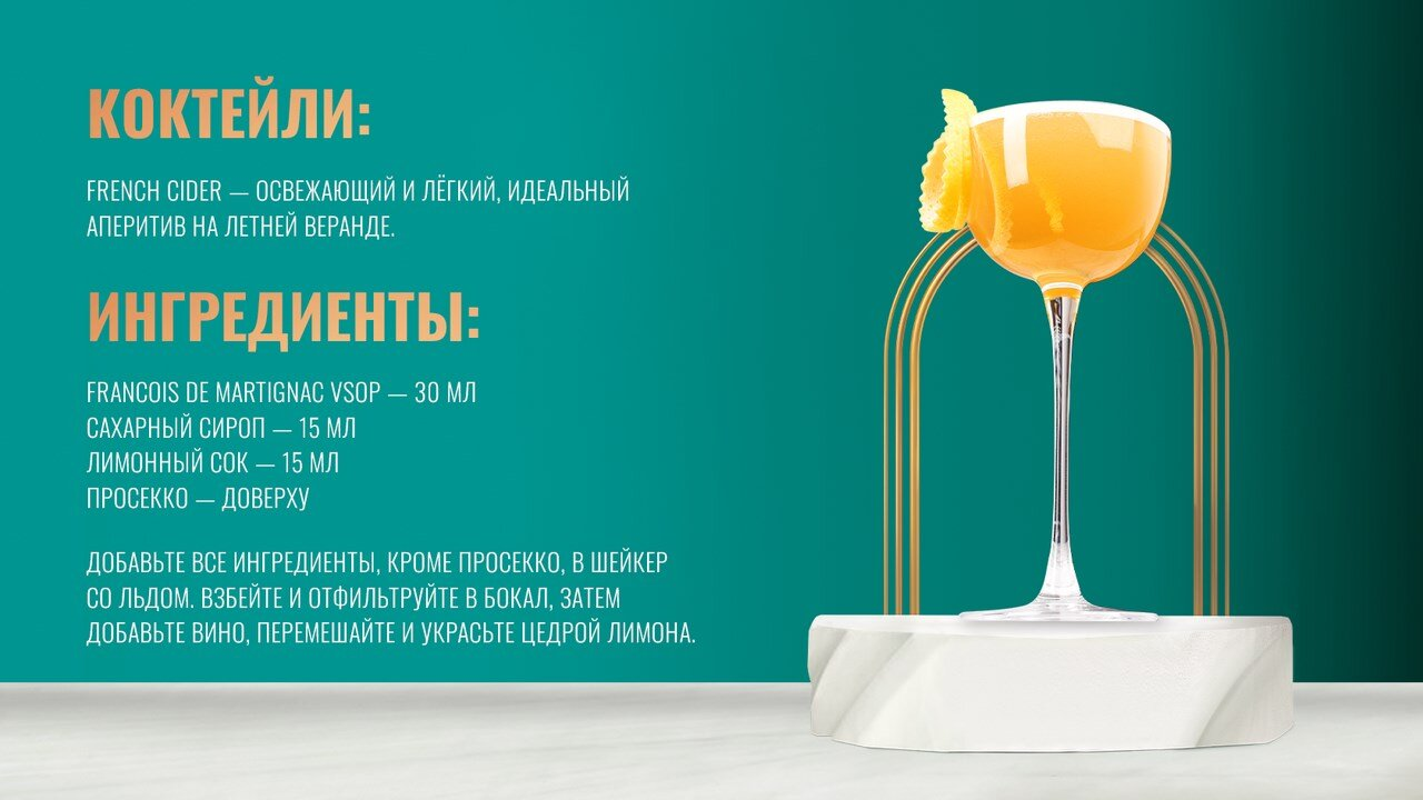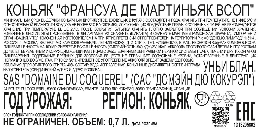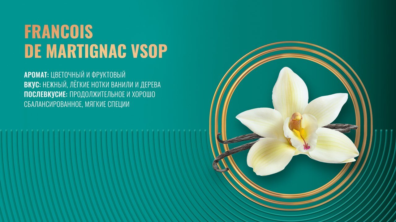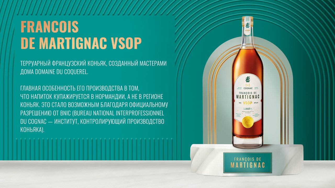 Cсовременное искусство вкуса. Дом Domaine du Сoquerel, винокурня которого расположена всего в нескольких километрах от всемирно известного Мон-Сен-Мишель в Нормандии, ведет свою историю с 1937 года. Francois de Martignac стремится подчеркнуть многогранность терруара региона Коньяк при помощи естественного развития eau-de-vie: без добавления сахара и карамели. ДНК бренда заключается в том, чтобы передать лучшие ноты винограда, создавая свежие, фруктовые и элегантные коньяки. Мягкий и элегантный - главные качества Francois de Martignac VSOP. Купаж трех регионов: Фен Буа, Бордери и Петит Шампань. Фруктовый букет сбалансирован, а ноты дуба не доминируют над свежестью. Этот коньяк прекрасно подойдет для потребления в чистом виде и станет отличным выбором для приготовления коктейлей. Следуя традициям дома, в купаж не добавляется сахар и карамельный коллер. Изысканный французский коньяк, в производстве которого используются коньячные дистилляты из винограда сорта Уни Блан без добавления карамели и сахара. Выдерживается коньяк в течение 4-8 лет в бочках из французского дуба. Коньяк является прекрасным дижестивом, его рекомендуется употреблять в чистом виде, со льдом или как сопровождение к сигаре.