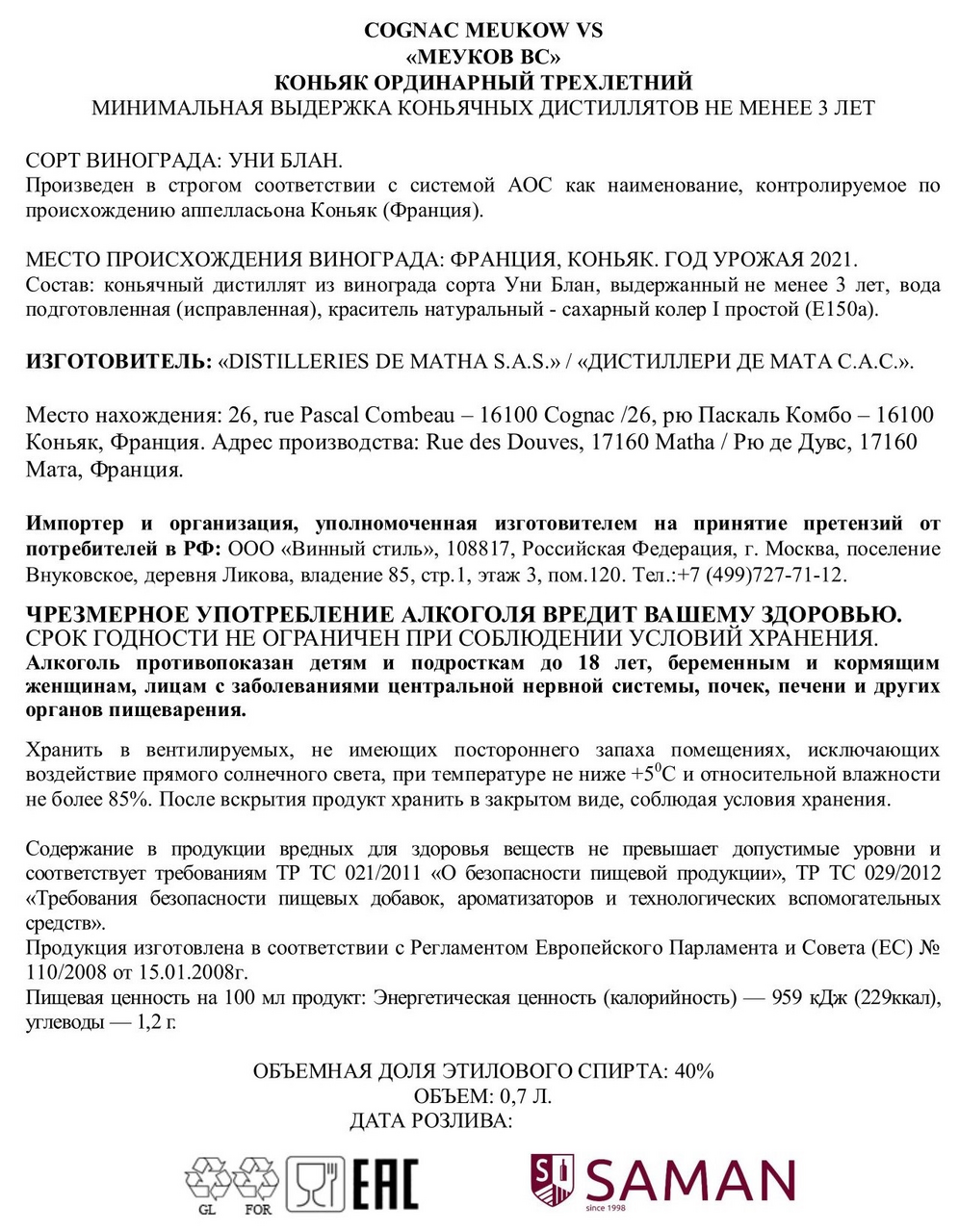 Блестящий золотой с медными оттенками. Аромат фруктовый и пряный, с нотами миндаля, засахаренного апельсина и лакрицы. Пряный с нотками лакрицы и мускатного ореха. Meukow VS характеризуется гармоничным сочетанием округлости фруктовых нот и деликатности древесных нюансов. В купаж коньяка Meukow VS входит большое количество старых спиртов, благодаря чему напиток обладает богатым ароматом и насыщенным, мягким вкусом. Коньяк выдерживается в дубовых бочках не менее 3-х лет. Разливается в элегантные бутылки с изображением черной пантеры. Коньяк прекрасен в чистом виде, рекомендуется в качестве дижестива.