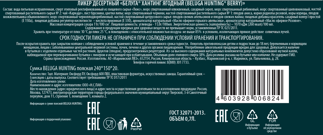 Ликер Beluga Hunting Berry Bitter + сумка в подарочной упаковке, 0.7л