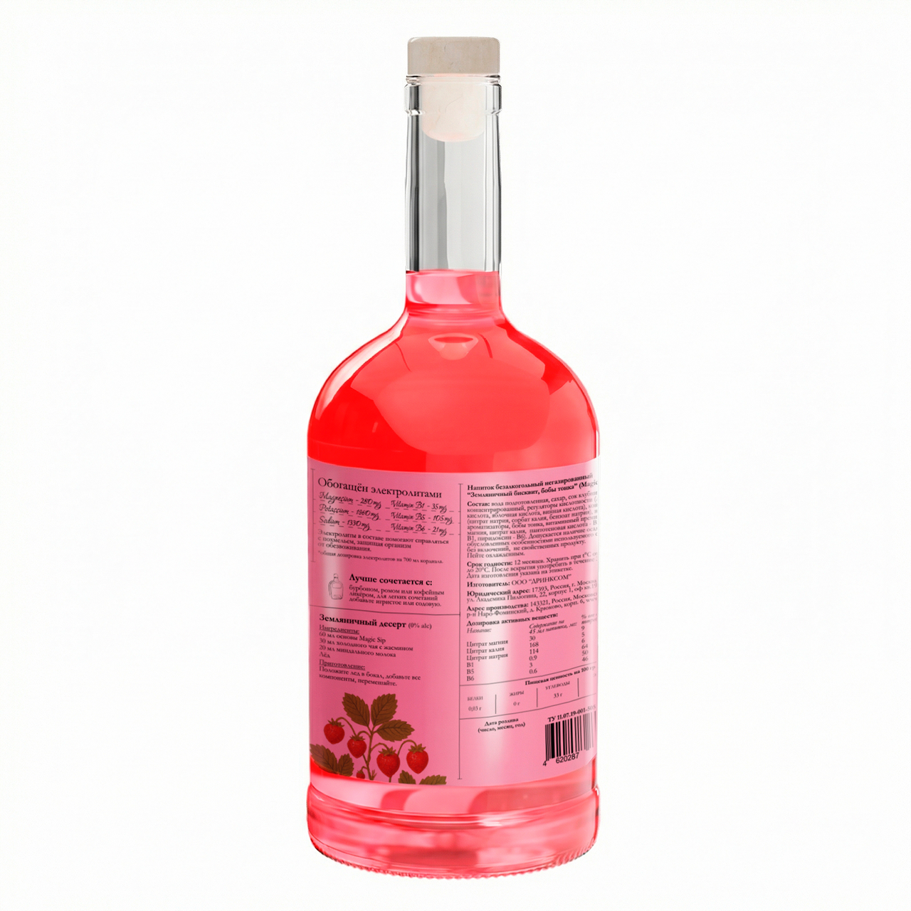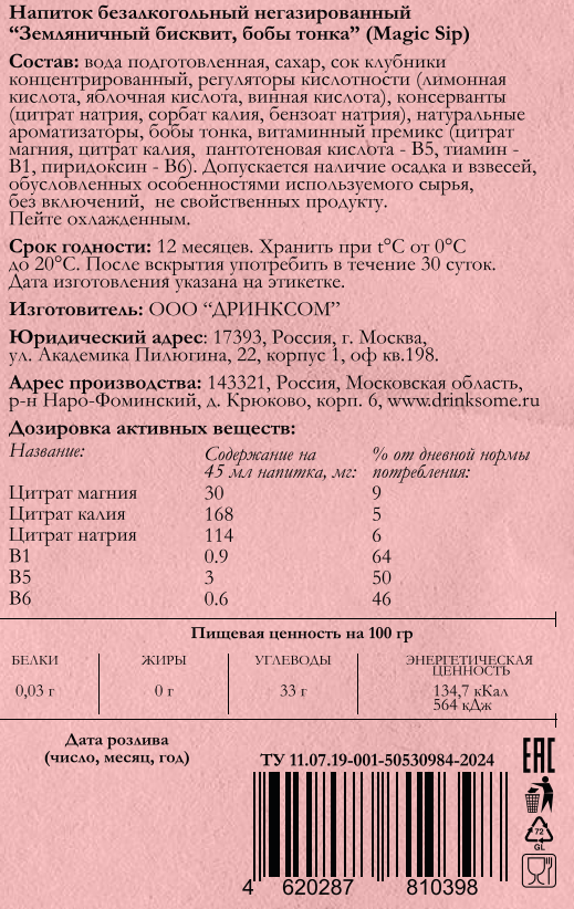 Вода подготовленная, сахар, сок клубники концентрированный, регуляторы кислотности лимонная кислота, яблочная кислота, винная кислота, консерванты цитрат натрия, сорбат калия, бензоат натрия, натуральные ароматизаторы, бобы тонка, витаминный премикс цитрат магния, цитрат калия, пантотеновая кислота - В5, тиамин - В1, пиридоксин - B6.