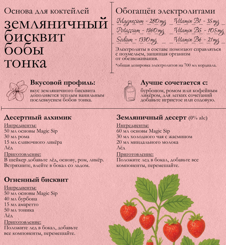 Отлично подойдет для разнообразных алкогольных и безалкогольных коктейлей. Он также может быть использован как основа для чая или лимонада. Самый простой способ сделать натуральный лимонад - это смешать нашу основу с минералкой. Больше рецептов разместили в карточке товара. Сироп для коктейлей в профессиональном сообществе называют кордиал, так что наш кордиал печенье-бобы тонка может стать отличным помощником за барной стойкой. Основа земляника - бобы тонка отлично сбалансирована по сладости и кислотности.