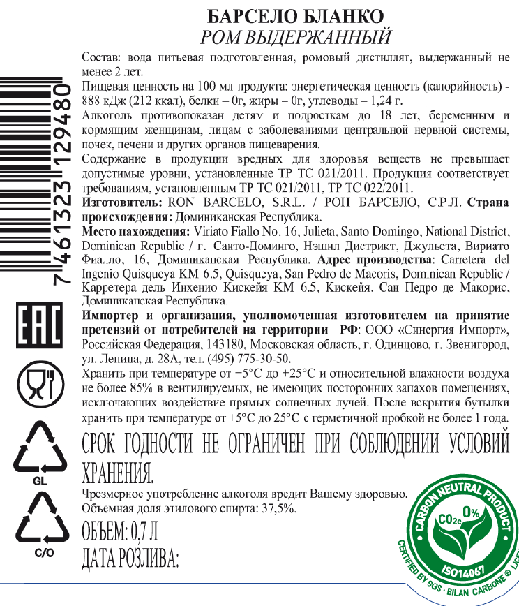 Ром Barcelo Blanco Anejado + стакан в подарочной упаковке, 0.7л