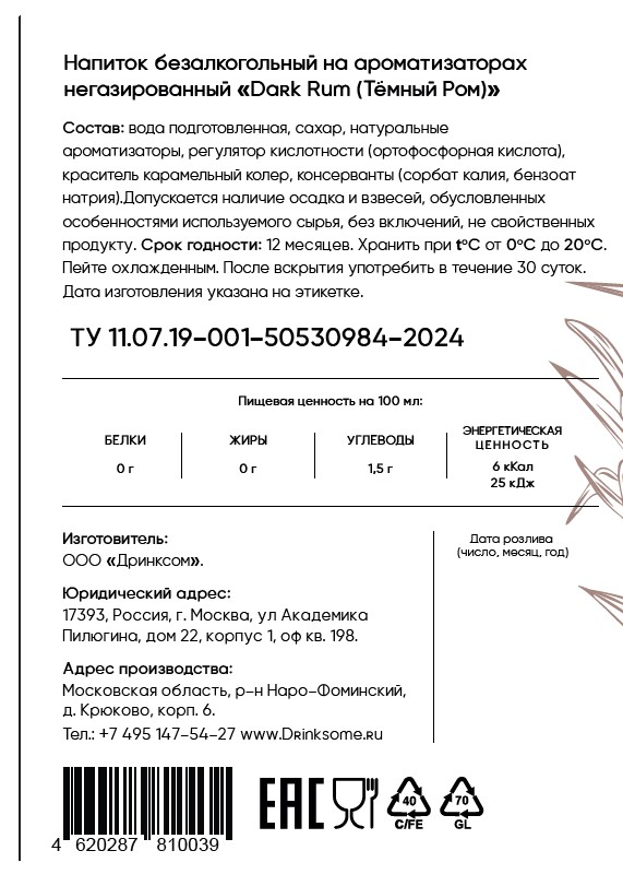 Напиток создан на основе набора безалкогольных дистиллятов и натуральных экстрактов сахарного тростника и специй - содержит всего 6ккал на 100мл - в 37 раз меньше, чем алкогольный. Насыщенный и сладкий напиток, вдохновением для которого послужил пиратский темный ром. Напиток создается исключительно на основе натуральных безалкогольных дистиллятов. В производстве рома используются коричневый сахар и ваниль, что и придает ему легко узнаваемый вкус и аромат. Дубовые бочки наделяют напиток приятной терпкостью. Безалкогольный ром - это идеальная основа для коктейлей.