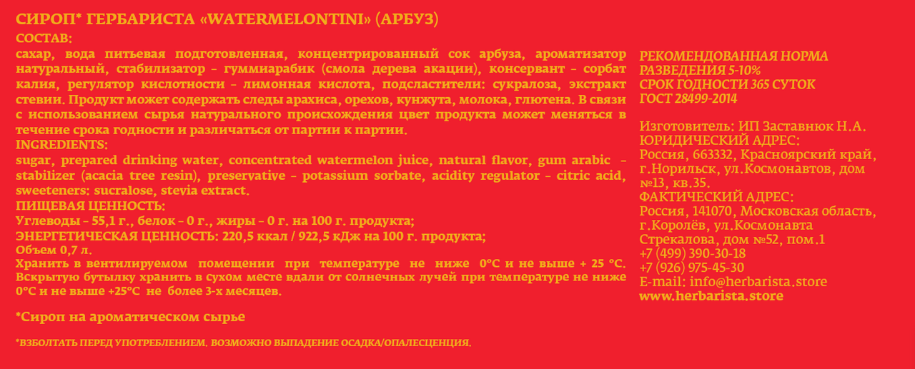 Сироп Herbarista Арбуз, 700мл х 6 шт