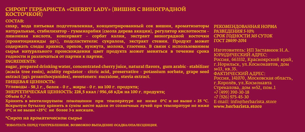 Сахар, вода питьевая подготовленная, концентрированный сок вишни, ароматизатор натуральный, стабилизатор – Тиксогам S (гуммиарабик с ксантановой камедью), регулятор кислотности - лимонная кислота, цитрат натрия 3-зам., консервант – сорбат калия, экстракт виноградной косточки (проантоцианиды 95%), подсластители: сукралоза, стевиолгликозид.
