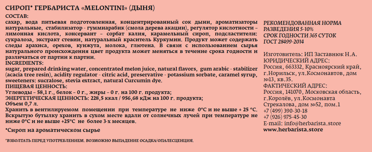 Сироп из золотисто-солнечной дыни, ягоды с медовой сладостью и манящим ароматом. Гормон радости! Во фруктовые и ягодные сиропы мы добавляем мякоть и сок фруктов и ягод, экстракты и натуральную ароматику, поэтому вкус получается насыщенный, многогранный и нежный. Мы бы хотели создавать просто вкусные сиропы, но они получаются волшебно вкусными и ароматными! Важной особенностью является высокая концентрация, поэтому у них более экономный расход. Уменьшенное содержание сахара! Благодаря содержанию стевии сиропы более полезные и менее калорийные! Входящая в состав смола дерева акации(гуммиарабик) придает тягучую плотную текстуру сиропу и позволяет ярче раскрыть вкус коктейлей, кофейных напитков или лимонадов. Аутентичные авторские рецепты из натуральных компонентов с использованием настоящих орехов, цитрусовых масел, соков и мякоти фруктов, специй и экстрактов, натуральной бурбонской ванили с зернами. Соблюдены все тонкости упаковки, что может стать отличным поводом преподнести вкусный сладкий подарок.