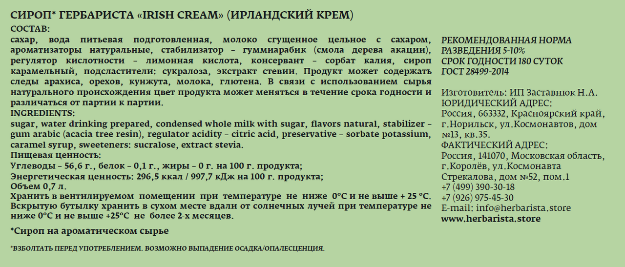 Сироп Herbarista Irish cream Ирландский крем, 700мл