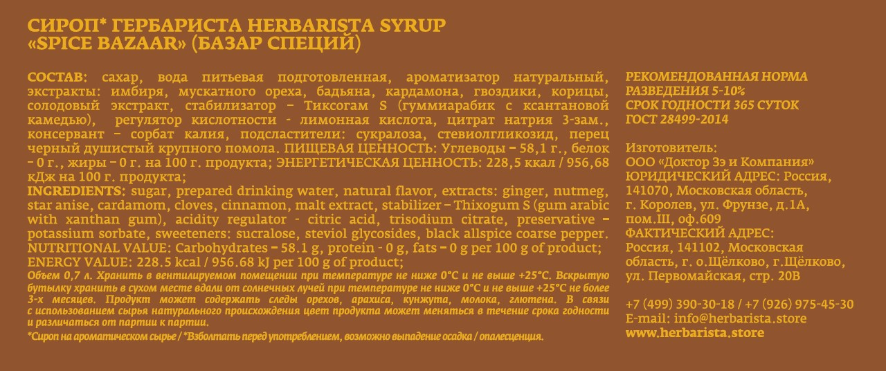 Сахар, вода питьевая подготовленная, ароматизатор натуральный, экстракты: имбиря, мускатного ореха, бадьяна, кардамона, гвоздики, корицы, солодовый экстракт, стабилизатор – Тиксогам S (гуммиарабик с ксантановой камедью), регулятор кислотности - лимонная кислота, цитрат натрия 3-зам., консервант – сорбат калия, подсластители: сукралоза, стевиол гликозид, перец черный душистый крупного помола.