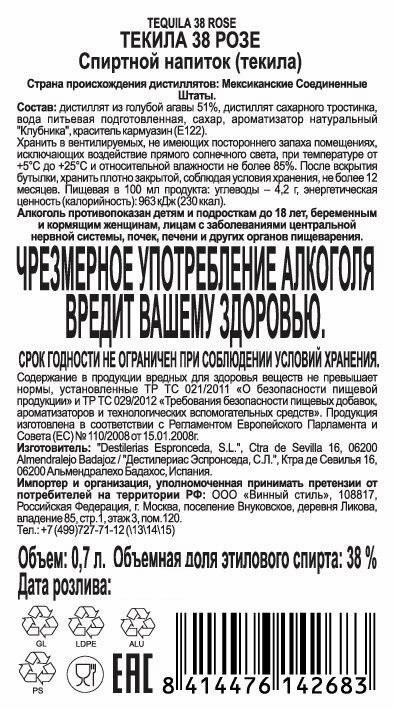 Дистиллят из голубой агавы 51%, дистиллят сахарного тростинка, вода питьевая подготовленная, сахар, ароматизатор натуральный Клубника, краситель кармуазин (Е122).