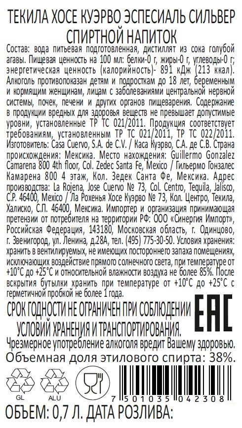 Текила премиум класса Especial Silver создана из голубой агавы. Она отличается мягким, очень гладким, свежим вкусом в виду того, что после дистилляции текила не выдерживается, а сразу разливается по бутылкам. В букете текилы ощущаются ноты агавы, послевкусие прекрасной чистоты, без резких укусов.