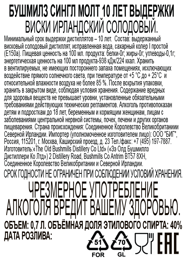 Виски Bushmills Single Malt 10 лет в подарочной упаковке, 0.7л