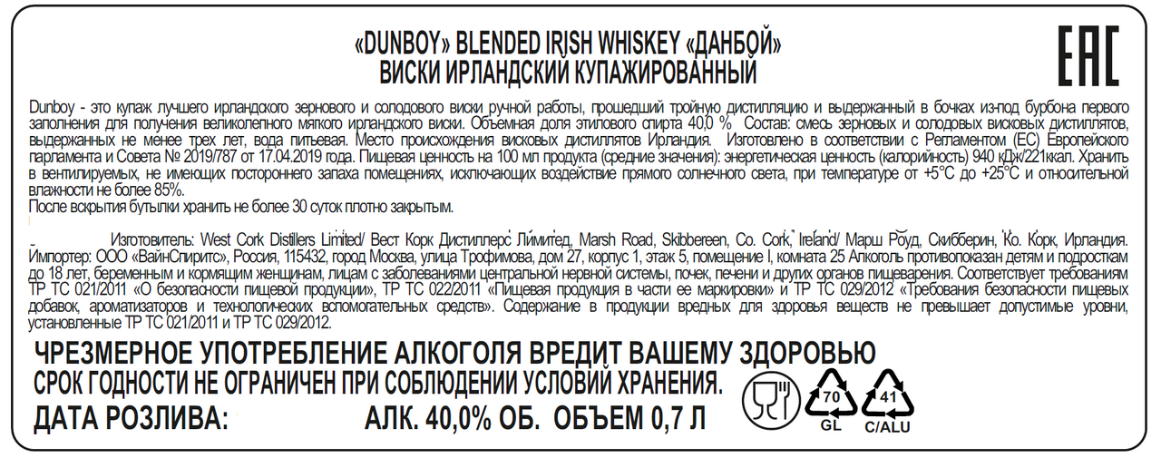 Виски Dunboy Ирландский купажированный, 0.7л