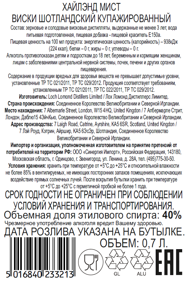 Шотландский купажированный виски, созданный из высококачественных спиртов Спейсайда, Лоуленда, Хайленда и Айлы. Его выдерживают 3 года в бочках, где прежде хранили херес и бурбон. Виски при этом приобретает богатый, насыщенный аромат и приятный карамельный вкус с нотами сладковатого солода и терпкого дыма. Бренд Highland Mist принадлежит известному производителю Loch Lomond Distillers.
