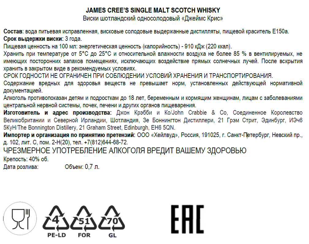 Виски шотландский James Crees Single Malt Scotch односолодовый, 0.7л
