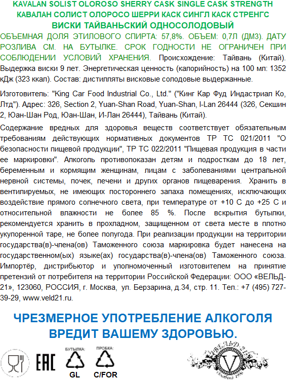 Выдержанный в специальных бочках из-под хереса Олоросо высшего качества, херес Kavalan Solist Oloroso разливается в бутылки на винокурне без какой-либо окраски или холодной фильтрации. Это естественно гладкий и богатый виски со сложным характером. Чистый и сложный, с множеством слоев сухофруктов, орехов и специй, в нем также есть нотки марципана и ванили.