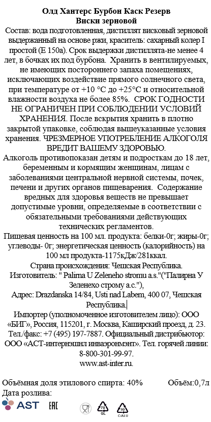 Вода подготовленная, дистиллят висковый зерновой выдержанный на основе ржи, краситель, сахарный копер, простой Е 150а. Срок выдержки дистилята не менее 4 лет в бочках из под бурбона.