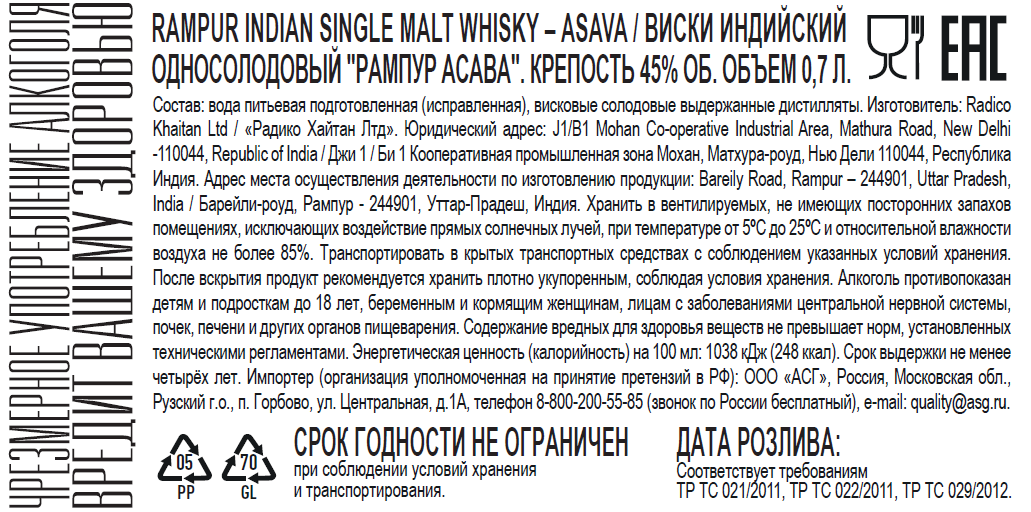 Индийский односолодовый виски, изготовленный вручную и выдержанный в предгорьях Гималаев. Гималаи обеспечивают полярные климатические условия в течение всего года, а знаменитое бабье лето придает виски дополнительную глубину. Основу виски составляет вода из горных источников. Виски перегоняется в традиционных медных перегонных кубах на старейшей винокурне в Индии, построенной в 1943 году. Черпая вдохновение из древнего торгового пути Инда, компания Radico Khaitan создала замечательный виски, не похожий ни на один другой. Выдерживая драгоценный спирт в бочках из-под американского бурбона, а затем кропотливо доводя его до совершенства в бочках из-под индийского вина Каберне Совиньон, мастера дарят каждому изысканный опыт — поистин�� божественный напиток, который служит свидетельством исторических инноваций. Поскольку индийский виски созревает значительно быстрее, чем другие, такие как шотландский или ирландский, Rampur обладает гладким, мягким вкусом с долгим послевкусием. Виски разливается при крепости 45% без холодной фильтрации.