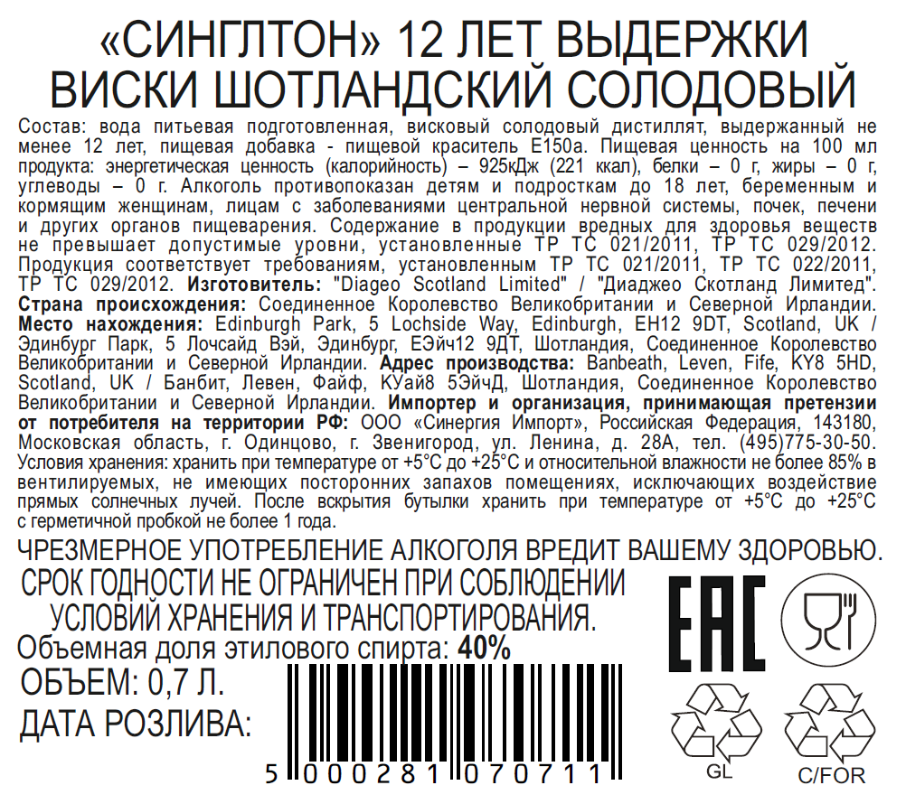 Вода питьевая подготовленная, висковый солодовый дистиллят, выдержанный не менее 12 лет, пищевая добавка - пищевой краситель Е150а.