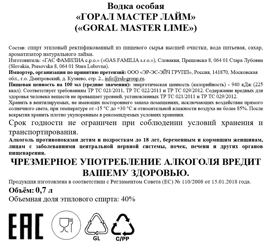 Уникальная водка с прекрасным, чистым и вневременным вкусом и тонким ароматом с освежающими нотками лайма, награжденная похвалами многих экспертов и многими медалями. Водка была названа в честь горалов — людей, проживающих в суровых горных условиях, которые закалили их тело и дух. Также и водка Goral позиционируется как мощный, наполненный природной силой и чистотой напиток.