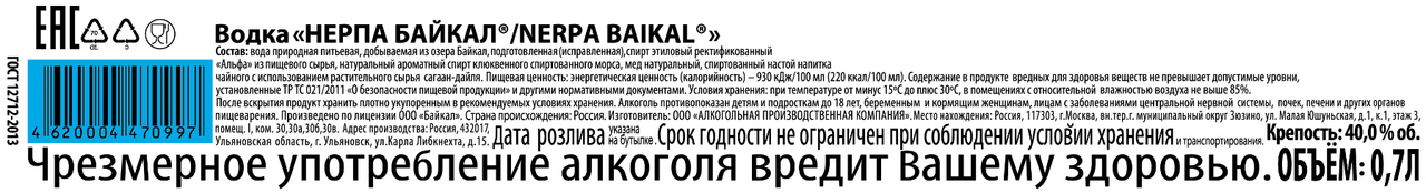 Изготавливается из трех ингредиентов — вода из озера Байкал, зерновой спирт Альфа и особый травяной сбор. Каждая капля водки насыщена кислородом уникальной экосистемы озера Байкал, которая существует благодаря нерпам. Производится на основе высокосортного зернового этилового ректификованного спирта Альфа и воды, добываемую из глубины самого известного водоёма в мире — озера Байкал, с добавлением ароматного спирта клюквенного спиртованного морса, натурального меда и Саган- Дайля (редчайшего растения, произрастающего на склонах байкальский гор). Ароматный спирт клюквенного спиртованного морса придает водке характерную мягкость и свежесть.