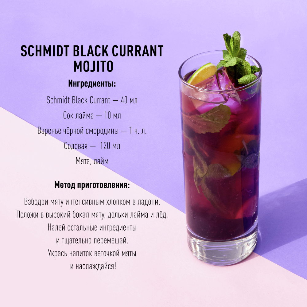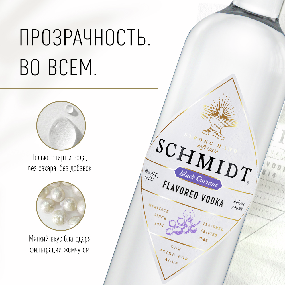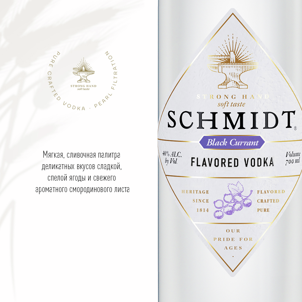 Искренняя линейка водочной продукции Schmidt, являющаяся универсальной базой для коктейлей. Чистый состав без сахара и добавок, натуральные яркие экстракты не перекрывают и не перетягивают органолептические особенности коктейля, а идеально дополняют общую вкусовую композицию. В рецептуре вкусовых водок Schmidt не допускается добавление сахара и не натуральных ароматизаторов или эфирных масел, что снижает нежелательные последствия на утро. Schmidt Black Currant - это особая водка с одним из самых популярных вкусов во всем мире - со вкусом черной смородины. Это мягкая, сливочная палитра деликатных вкусов сладкой, спелой ягоды и свежего ароматного смородинового листа. Яркий и насыщенный аромат ягодного щербета, обволакивающий вкус нежного джема и мягкое послевкусие с легкой сладостью летней ягоды. Все это - купаж исключительно натуральных ингредиентов, без добавок и сахара. Особая водка со вкусом черной смородины. При изготовлении водки не допускается добавление сахара и ненатуральных ароматизаторов или эфирных масел. Черносмородиновая водка изготавливается на базе премиальной водки Schmidt Supreme, которая отличается своим чистым составом без примесей и искусственных добавок. Для производства водки используют исключительно высококачественный зерновой спирт, который получают из отборной пшеницы, ржи и тритикале, и чистейшую воду, добытую на глубине 220 метров из собственной скважины компании. Исключительная особенность водки Шмидт Суприм, которая и делает ее такой уникальной - жемчужная фильтрация. Технология жемчужной фильтрации не имеет аналогов во всем мире, благодаря ей водка приобретает несравненно мягкий и питкий вкус. Идеальна в чистом виде, также ее можно использовать для приготовления коктейлей.