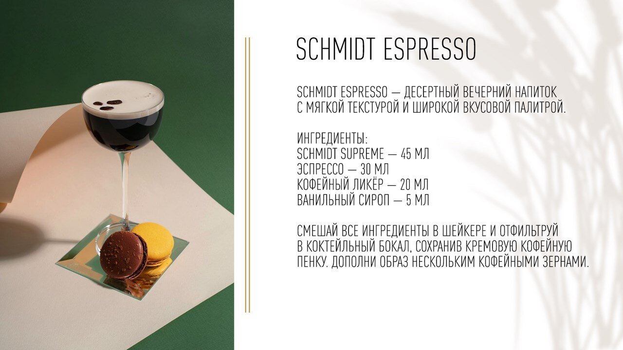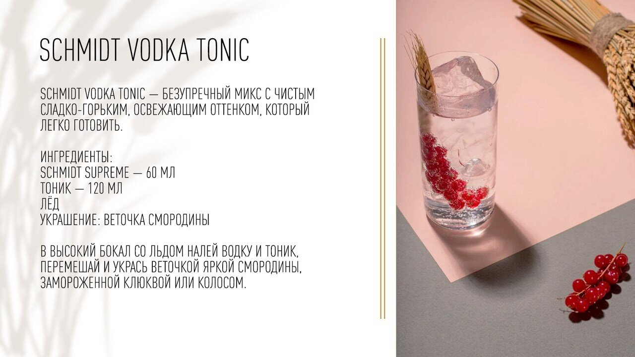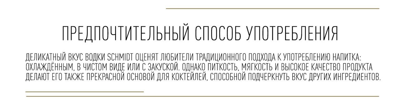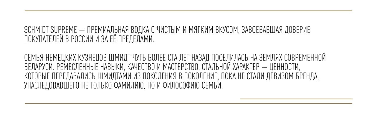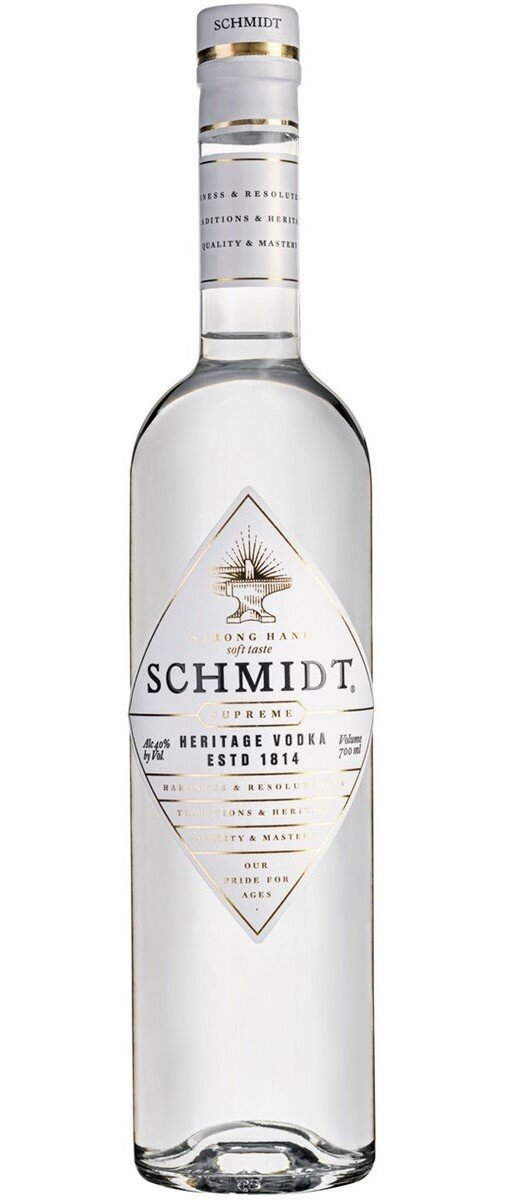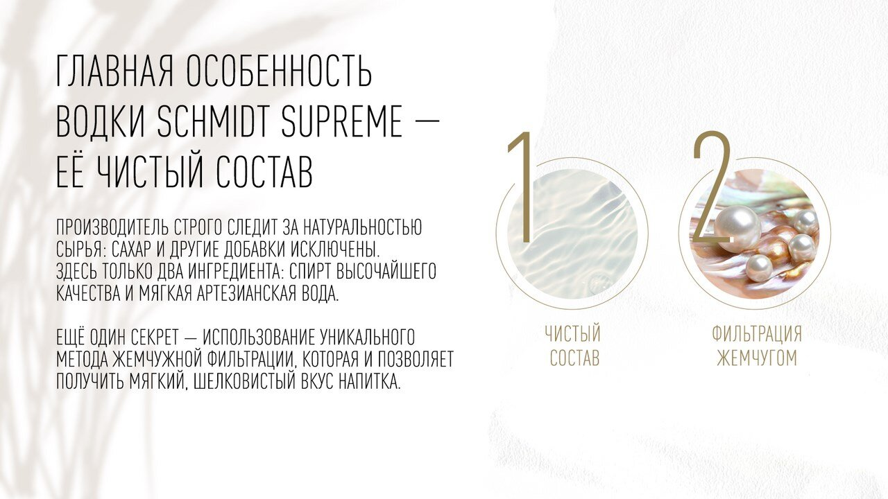 Бренд Schmidt Рожден в семье немецких кузнецов, поселившихся на землях Белоруссии. Воплощает в себе навыки ремесленников, стальной характер, качество и мастерство. На протяжении 200 лет наследие семьи передается из поколения в поколение, а 6 ключевых ценностей как гарант запечатлены на этикетке продукта. Водка Schmidt - премиальный продукт, который производится с помощью жемчужной фильтрации, аналогов которой нет во всем мире. Жемчуг – единственный драгоценный камень, который не требует никакой огранки и хорош за счет естественности и простоты. Так же и водка Schmidt Supreme, искренняя, естественная и чистая (только спирт и вода). Жемчужная фильтрация придает продукту несравнимую мягкость и питкость без необходимости дополнительной огранки и добавок. Вода для водки Schmidt добывается из собственной скважины на глубине 220 метров, что позволяет использовать ее без грубой фильтрации, сохраняя все лучшие качества. Премиальная водка, которая отличается своим чистым составом без примесей и искусственных добавок. Для производства водки используют исключительно высококачественный зерновой спирт, который получают из отборной пшеницы, ржи и тритикале, и чистейшую воду, добытую на глубине 220 метров из собственной скважины компании. Исключительная особенность водки Шмидт Суприм, которая и делает ее такой уникальной - жемчужная фильтрация. Технология жемчужной фильтрации не имеет аналогов во всем мире, благодаря ей водка приобретает несравненно мягкий и питкий вкус.
