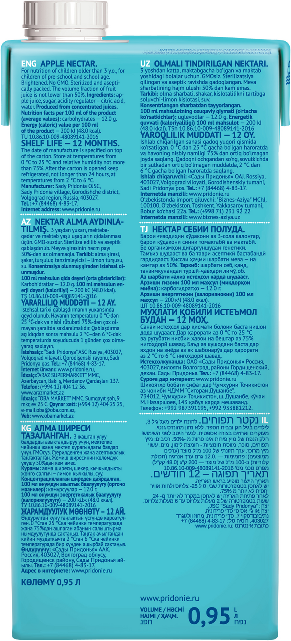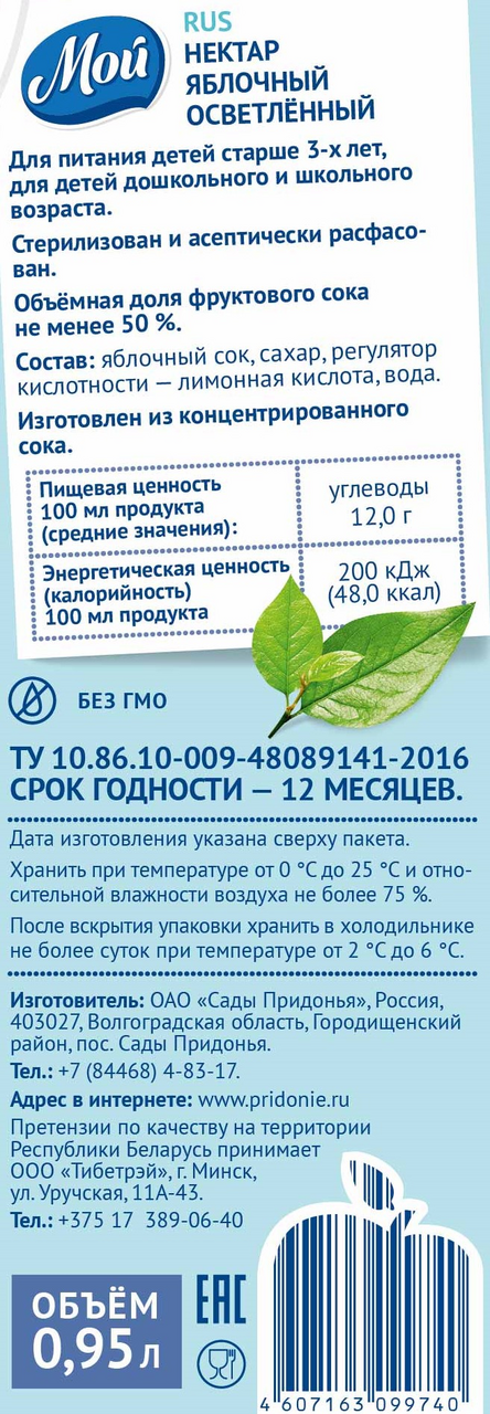 Нектар Мой яблоко осветленный, 950мл x 12 шт - классический кисло-сладкий вкус спелых яблок, насыщенный с умеренной сладостью. В жару он поможет освежиться с пользой для здоровья, а зимой - укрепить организм полезными веществами и вспомнить вкус лета. Попробуйте использовать напиток в коктейлях, дополняйте десерты или просто пейте охлажденным.