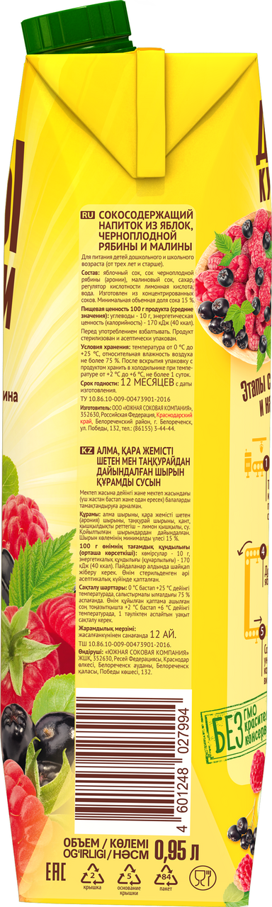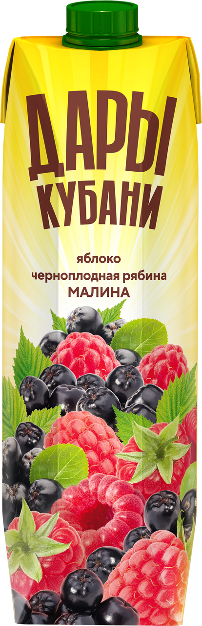 Напиток сокосодержащий Дары Кубани с яблоком, черноплодной рябиной и малиной, 950мл x 6 шт - сокосодержащий напиток Яблоко, черноплодная рябина, малина от бренда Дары Кубани - витаминное и вкусное сочетание местных ягод и фруктов. Подходит как для детей, так и для всей семьи. Это сочетание яблочного сока и спелых душистых ягод. Вкус и аромат спелой малины раскрывается в насыщенном напитке. Приготовлен без добавления красителей и консервантов.