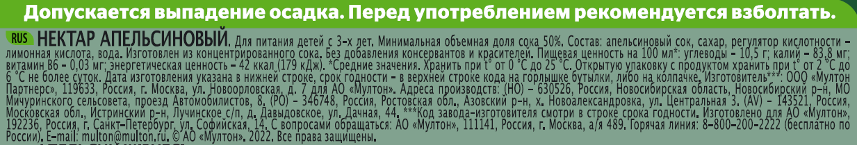 Нектар с мякотью, изготовленный из концентрированного апельсинового сока. Это фрукт повышает работоспособность, улучшает настроение, усиливает иммунитет. Апельсин славится большим содержанием витамина С, также в нем содержатся витамины А, В1 и В2, способствующие очищению крови и улучшению аппетита. Апельсины оказывают противовоспалительный, противовирусный эффект, препятствуют образованию тромбов, способствуют снижению холестерина в крови. Входящие в химический состав апельсина магний, калий, кальций, фосфор, железо, цинк и йод наделяют организм жизненной силой, регулируют рост и замедляют старение. Кроме того, апельсин — сильный антиоксидант.Производится из апельсинового сока. В составе концентрированный сок, вода и сахар, что позволяет сохранить все витамины, полезные для организма человека. Дополнительно обогащен витамином С. Попробуйте использовать напиток в коктейлях, дополняйте десерты или просто пейте охлажденным.