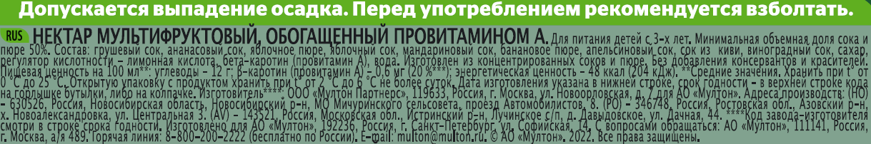 Нектар, изготовленный из концентрированных соков и пюре: грушевого сока, ананасового сока, яблочного пюре, яблочного сока, мандаринового сока, бананового пюре, апельсинового сока, сока из киви, виноградного сока. Содержит витамин С, который тонизирует организм и способствует укреплению иммунитета. Нектар является источником провитамина А, который способствует повышению выносливости организма и производству коллагена, важного для восстановления клеток, а также микроэлементов и антиоксидантов.