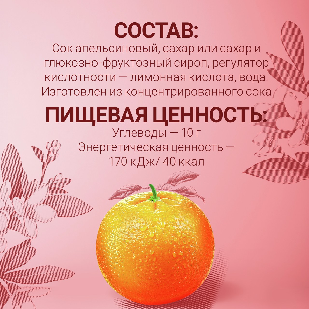 Натуральный восстановленный сок, приготовленный без добавления консервантов, красителей и подсластителей. У него чистый апельсиновый вкус, с характерной кислинкой и оптимальным количеством мякоти. Свежий, бодрящий, вдохновляющий на новые свершения и поднимающий настроение с каждым глотком.