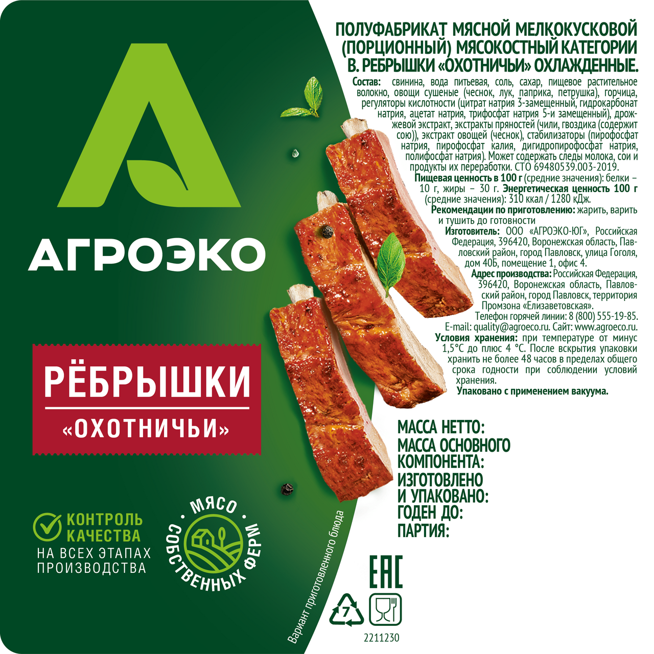 Ребрышки АгроЭко Охотничьи охлажденные, ~900г