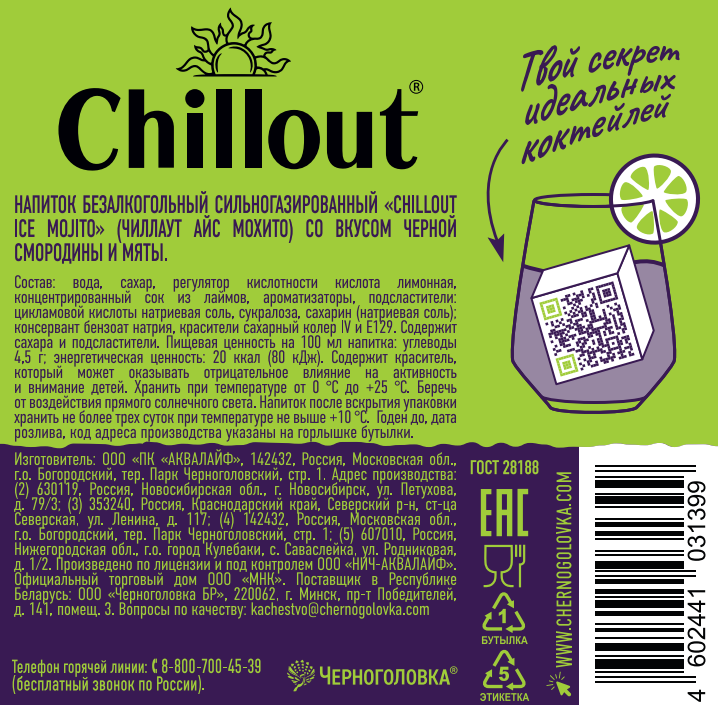 НапитокChillout Ice Mojito Черная смородина и мята газированный, 900мл х 12 шт